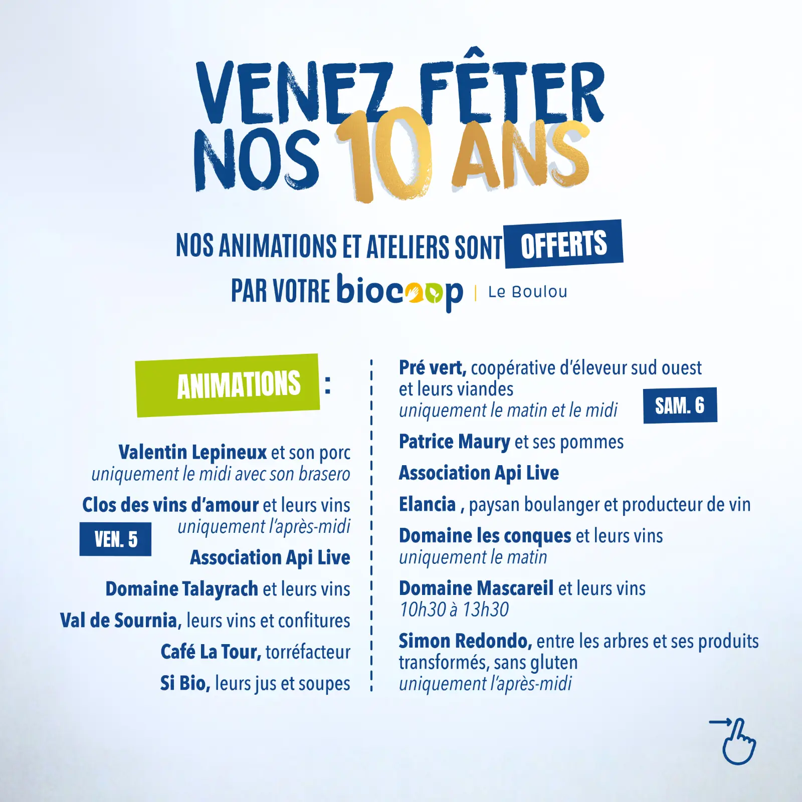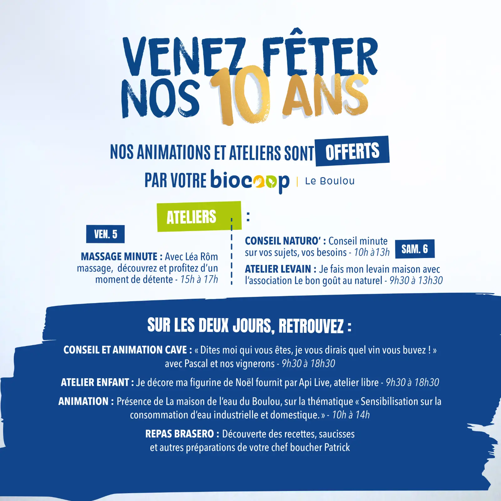 Pour célébrer cette décennie d’action partagée et pour vous en remercier, nous vous invitons à deux jours dédiés à celles et ceux qui font vivre cette démarche : producteurs locaux, artisans, équipes du magasin et consommateurs engagés. Ensemble, nous construisons un modèle plus durable, plus humain et plus responsable.